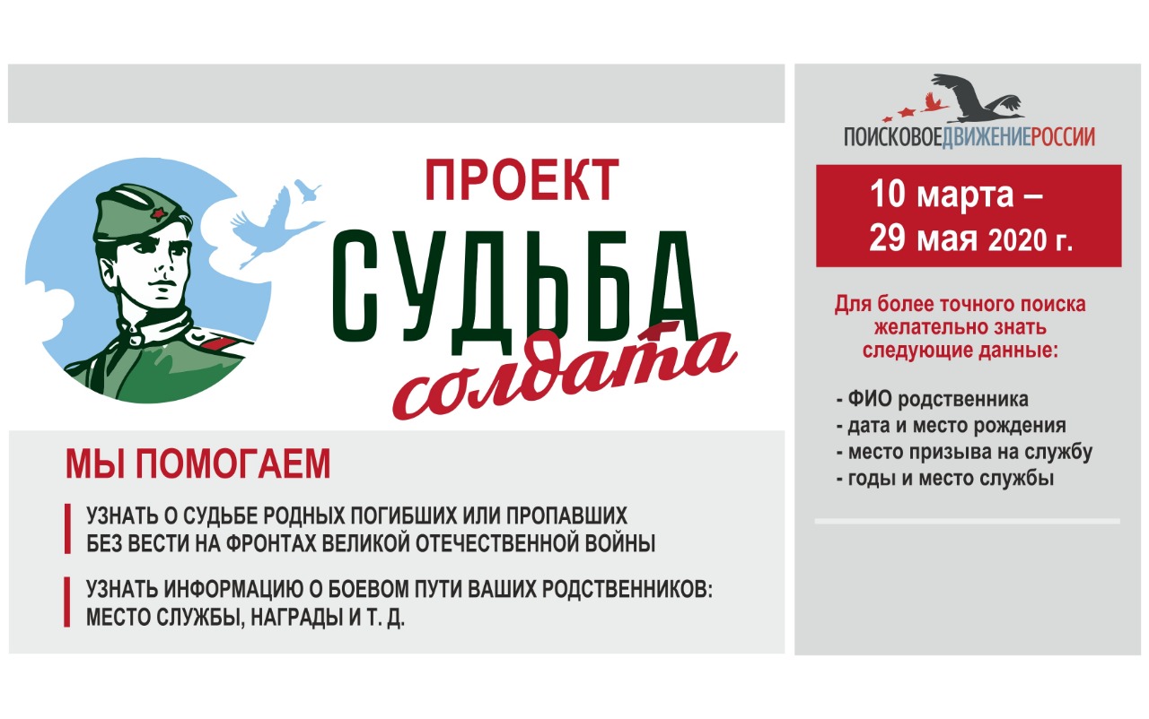 «Великая Отечественная война затронула каждую российскую семью, и, к сожалению, многие наши соотечественники до сих пор не знают о судьбах своих родных, ушедших на фронт и не вернувшихся с полей сражений. «Поисковое движение России» при поддержке Министерства обороны РФ запустило проект «Судьба солдата» в 2017 году. Он посвящен помощи гражданам в установлении судеб фронтовиков, независимо от того, погибли они, пропали без вести или вернулись домой, но родственникам хочется что-то уточнить об их боевом пути», – рассказали организаторы.