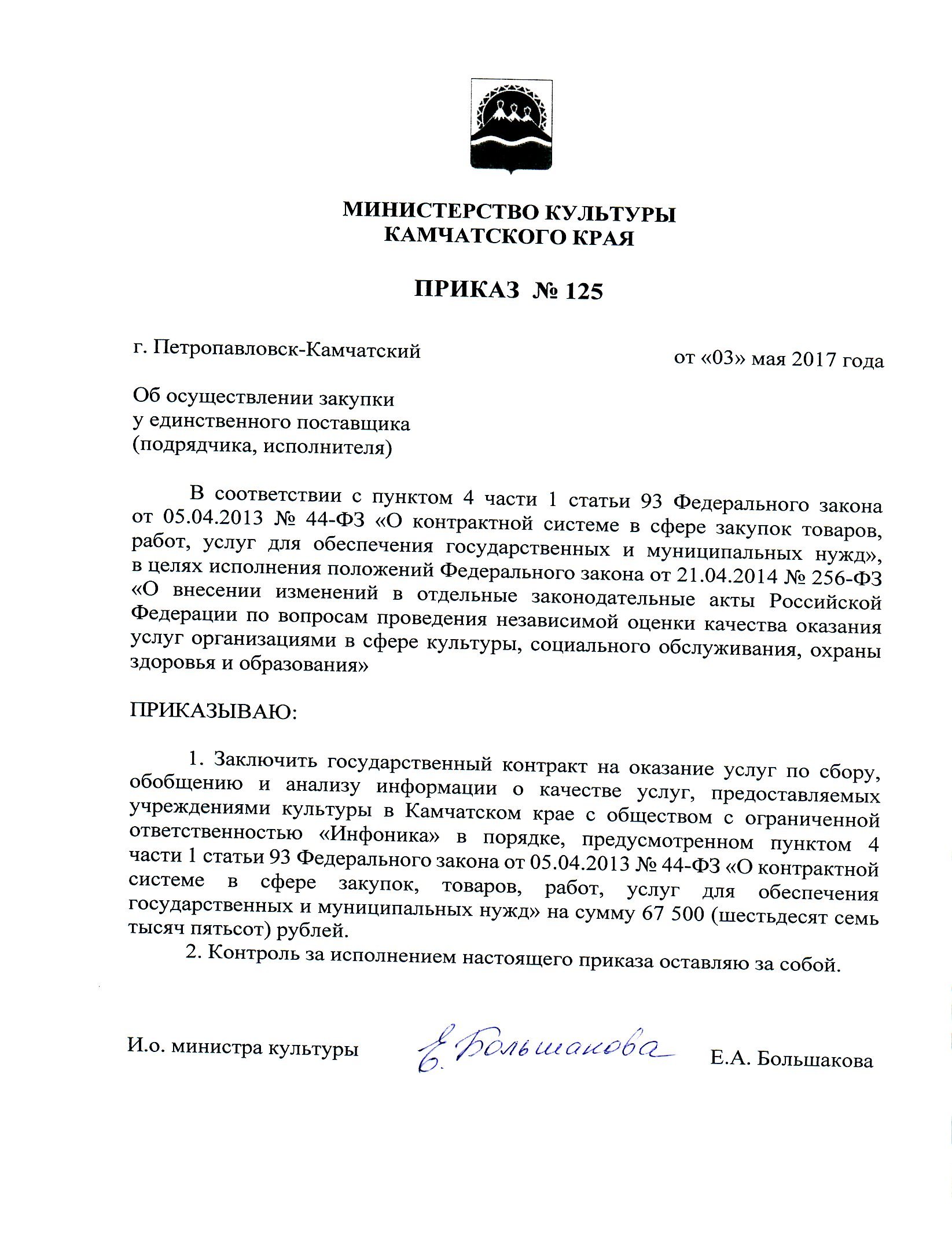 Приказ Министерства культуры Камчатского края № 125 от 03.05.17 Об осуществлении закупки у единственного поставщика