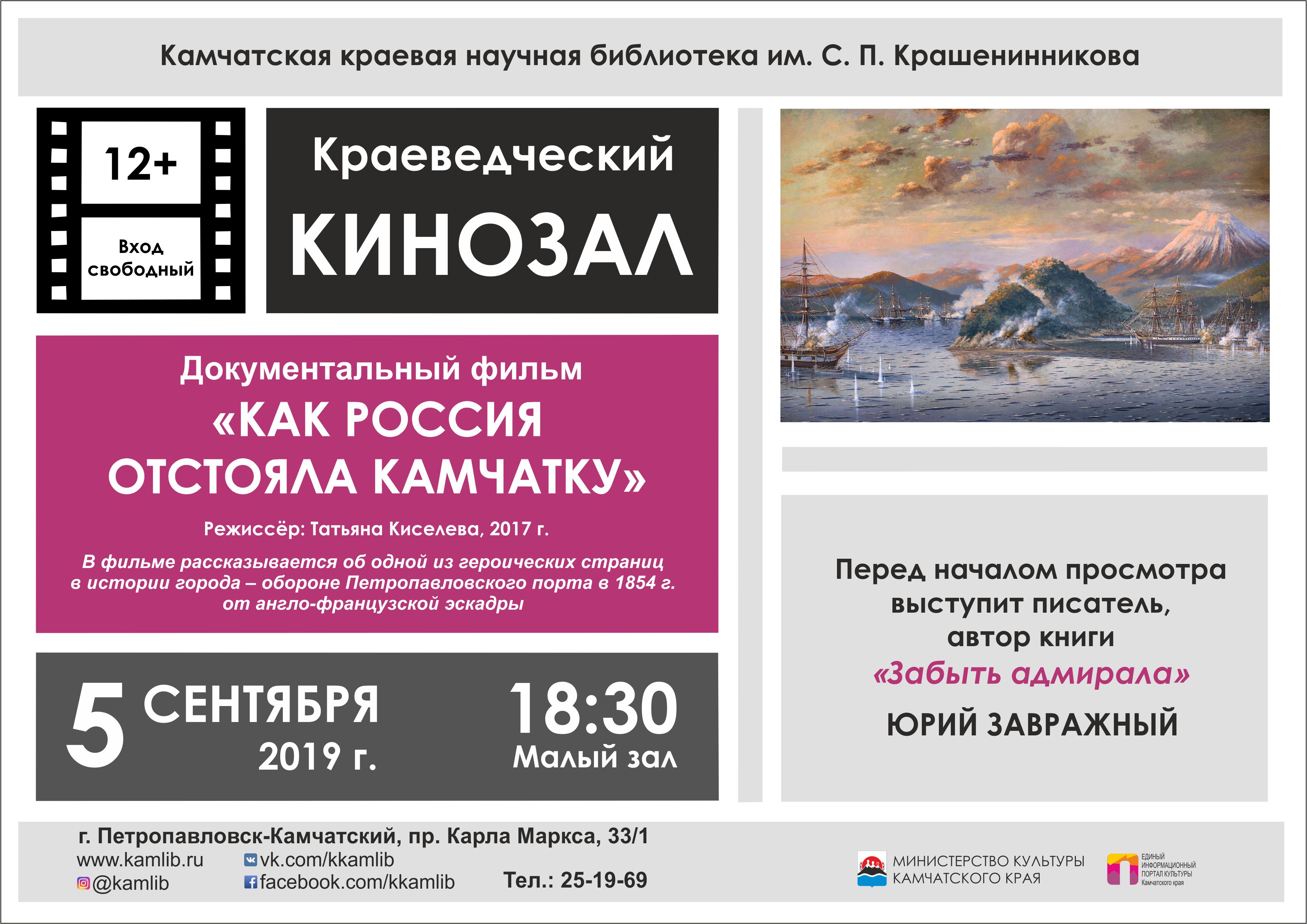 5 сентября в 18:30 в малом зале Камчатской краевой научной библиотеки имени С. П. Крашенинникова в проекте краеведческий кинозал покажут фильм «Как Россия отстояла Камчатку», снятый в 2017 году режиссером Татьяной Киселевой. Об этом сообщили в министерстве культуры субъекта.